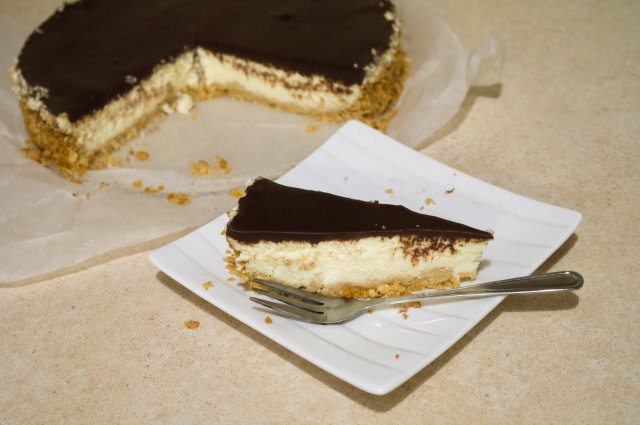 Jajka roztrzepać ze śmietaną. Wlać do gotującego się mleka, jeśli się nie zwarzy - dodać ocet. Odcedzić na sitku. Do "twarogu" dodać cukier i masło i zmiksować. Wyłożyć blaszkę herbatnikami, wylać masę serową, przykryć herbatnikami i polać polewą.