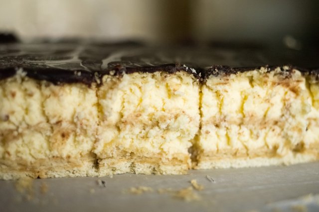 Jeden z wcześniej upieczonych placków zapiąć w tortownicy. Na niego wylać połowę masy serowej i przykryć drugim kruchym plackiem. Następnie wylać pozostałą część masy serowej i przykryć trzecim, ostatnim plackiem. Sernik schłodzić przez 12 h (całą noc) w lodówce.