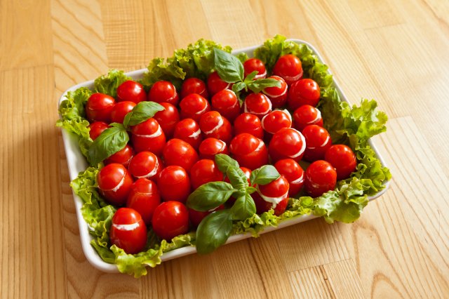 Pomidorki umyć i osuszyć. Odciąć okrągły koniec (przeciwległy do szypułki). Wydrążyć, lekko posolić i odwrócić. Zostawić na chwilę.Twaróg przyprawić śmietaną, czosnkiem, solą i pieprzem. Dobrze rozdrobnić widelcem. Można dodać zioła: szczypiorek, bazylię lub oregano. Łyżeczką lub szprycą nałożyć twarożek do wydrążonych pomidorków. Przykryć odciętym końcem.