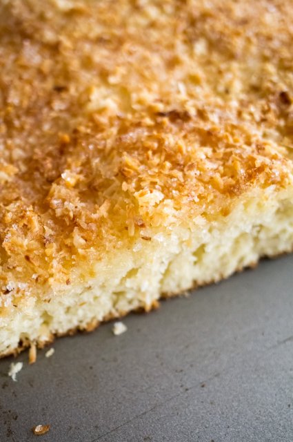 Mąkę, cukier (szklankę) i proszek do pieczenia wymieszać w misce. W drugiej misce wymieszać maślankę i jajka. Do mokrych składników dodać stopniowo suche i wymieszać. Wylać na blachę. Kokos wymieszać z 1/3 szklanki cukru i cukrem waniliowym. Posypać ciasto. Piec około 20 - 50 minut (w zależności od wielkości blachy). Na gorące ciasto wylać śmietankę.