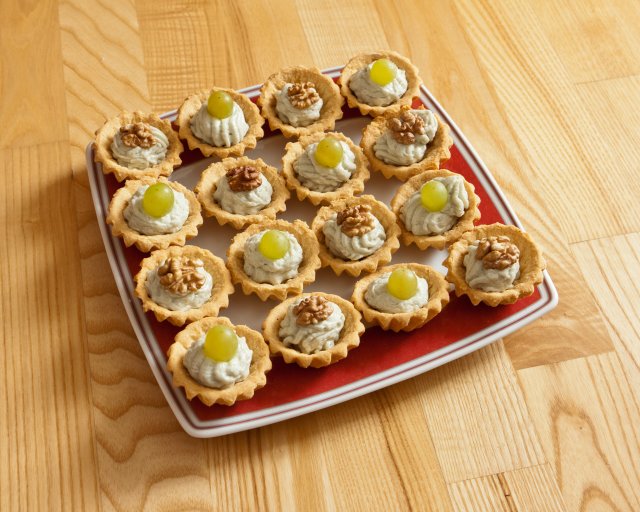 Ser rozkruszyć widelcem, dodać śmietanę i utrzeć. Udekorować orzechami włoskimi, koprem lub winogronami.