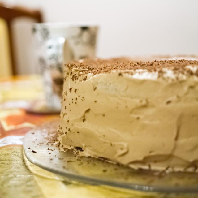 Czekoladę połamać razem z kawą dodać do śmietany. Podgrzać aż wszystkie składniki się rozpuszczą. Dobrze schłodzić.Przed samym wykonaniem tortu wyjąć masę z lodówki i ubić uważając, by masa się nie zważyła.
