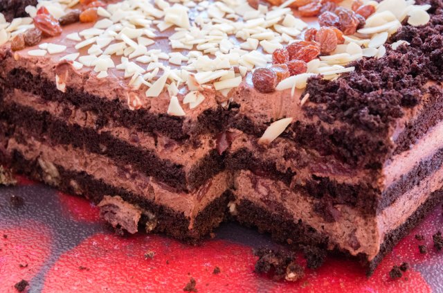 pierwszy blat położyć na talerzu. Nasączyć sokiem wiśniowym wymieszanym z alkoholem. Nałożyć część kremu. Położyć wiśnie, lekko docisnąć. Położyć drugi blat i powtórzyć czynności. Trzeci blat nałożyć, nasączyć i położyć krem. Tort ozdobić. Można pokruszyć ściętą czapeczkę.