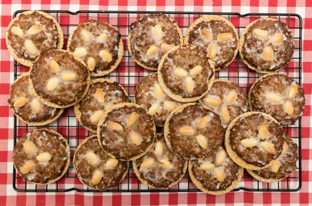W naczyniu wymieszać białka (nie ubijamy ich wcześniej) z miodem i cukrem, do połączenia składników. Dodać zmielone migdały, posiekane orzechy, mąkę pszenną, przyprawy korzenne, proszek do pieczenia, masę marcepanową, kandyzowane skórki z cytrusów. Dobrze wymieszać, do połączenia (można mikserem). Powstałe ciasto powinno mieć konsystencję pasty. Jeśli ciasto jest zbyt rzadkie należy dodać niedużo zmielonych migdałów lub mąki, jeśli zbyt gęste - odrobinę białka.